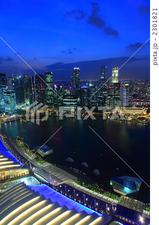マリーナ・ベイ・サンズのスカイパークから見たラッフルズ・プレイスの夜景