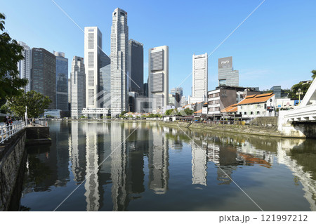 Panoramic view of the skyscrapers in the Financial District of Boat Quay along the Singapore River.