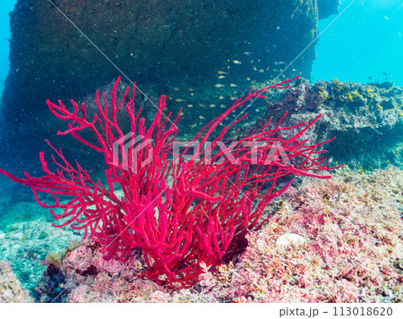 美しいソラスズメダイ他の群れとウミトサカ、イボヤギ他のソフトコーラルが群生する美しい岩礁 ヒリゾ浜