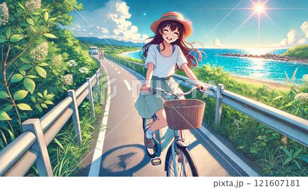 駿河湾の海の夕陽と一人旅女性のシルエット