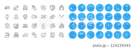 Vector icons set of Smartphone recovery, Computer mouse and Favorite line icons pack for web with Loyalty program, Lock, Settings blueprint outline icon. Phone protection, Service. Vector