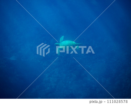 美しく大きなアオウミガメ(ウミガメ科)とサンゴの群生。 東京都伊豆諸島式根島丸根ヶ浜にて。 202