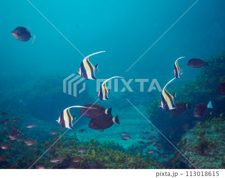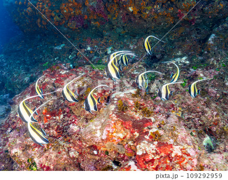 ヒリゾ浜のドロップオフの美しいツノダシ(ツノダシ科)他の群れ。 静岡県伊豆半島賀茂郡南伊豆町中木か