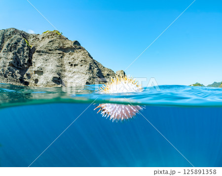 膨らんだハリセンボンとスキンダイバーの半水面撮影。ヒリゾ浜中木南伊豆町伊豆半島静岡県2024