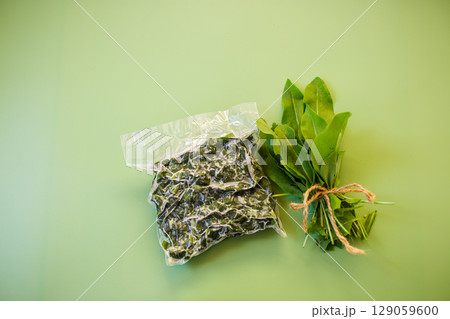 Frozen sorrel in a bag and a bunch of fresh sorrel