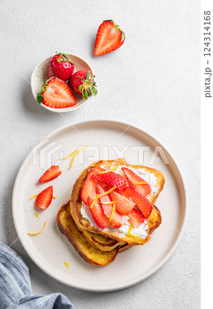 Toasted bread with cream cheese and strawberries on a plate on a light background with fresh berries