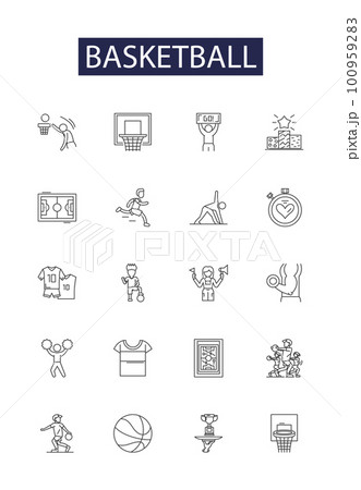 Basketball line vector icons and signs. Court, Shooting, Layup, Dunk, Run, Pass, Rebound, Jump outline vector illustration set