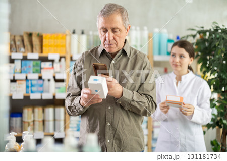 Mature man scans QR code on box cough syrup label. Female pharmacist offers various cough syrups
