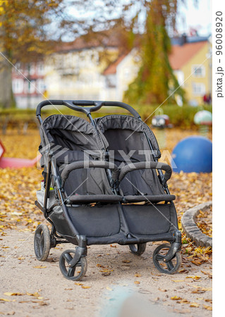 Father with child and baby walking with stroller in winter snow park. Happy family, connections on