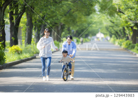 新緑の公園を歩く家族