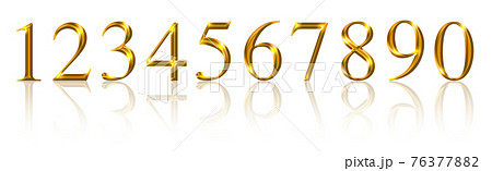 Golden numbers, from one to zero over white. Ten gold colored, metallic shimmering and three-dimensional numerals with reflections, to express an anniversary, a jubilee or another value. Illustration.