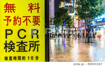 日本の東京都市景観 新宿東口のMOA2番街入口にある無料PCR検査所