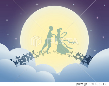 七夕,中國情人節插圖,牛郎織女在夜空中的鵲橋相會