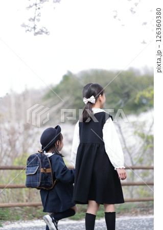 桜と入園式を迎えた3歳の女の子と9歳の姉