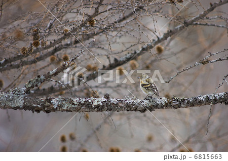 東京都三鷹の野鳥 仙川公園の枯れ木にとまるアトリ