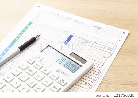 机に置かれた確定申告書類と電卓