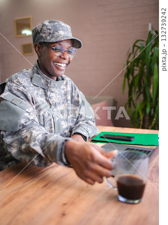 Smiling african american female soldier drinking coffee during work break at home