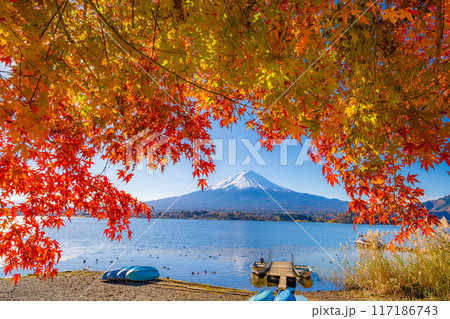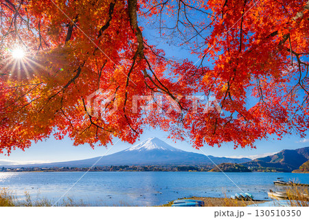 【富士山素材】秋の河口湖から見る冠雪した富士山と紅葉【山梨県】