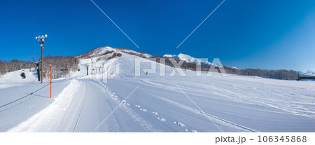 [パノラマ] 快晴の朝の閑静なスキー場 (北海道、ニセコモイワスキーリゾート)