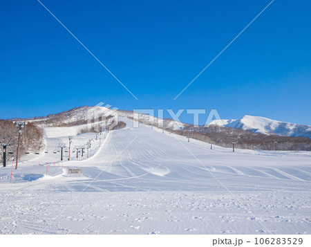 快晴の朝の閑静なスキー場 (北海道、ニセコモイワスキーリゾート)