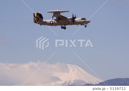 澄み切った冬空の神奈川県丹沢山系を背景に飛行する米海軍E-2Cホークアイ早期警戒機