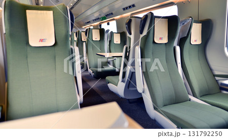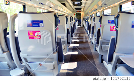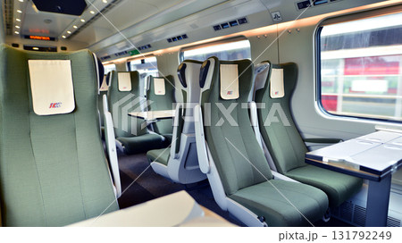 Warsaw, Poland. 15 July 2025. Interior of a passenger train. Empty chairs in the wagon. PKP Intercity. Interior of a Pendolino carriage.