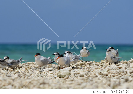 ベニアジサシ エリグロアジサシ 群れ コロニー 繁殖地 若鳥 幼鳥 渡り鳥 夏鳥 水鳥 海鳥