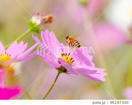 秋の景色 可憐でかわいいカラフルなコスモスの蜜を吸うミツバチ