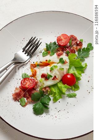 poached egg, with bacon and vegetables, breakfast, homemade,