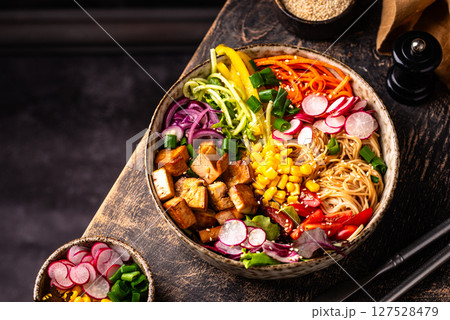 Vegan salad, bowls with chickpeas, broccoli, tomatoes, tofu cheese and boiled eggs