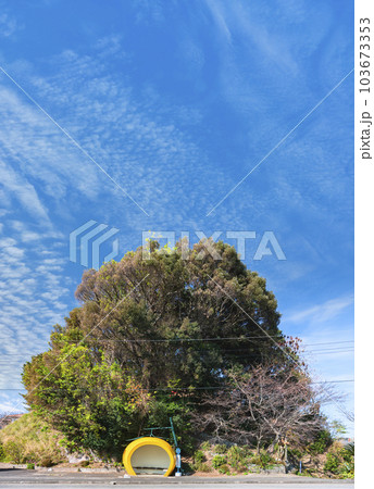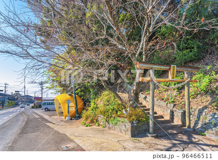 [九州・諫早] ときめきフルーツ通りの蜜柑バス停と金刀比羅宮の鳥居。