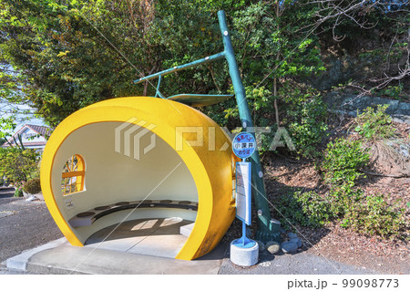 [九州・諫早] ときめきフルーツバス停通りに位置する蜜柑型の小深井バス停。