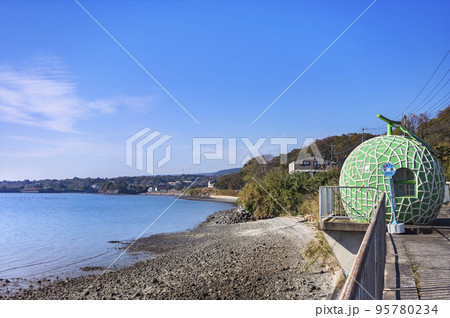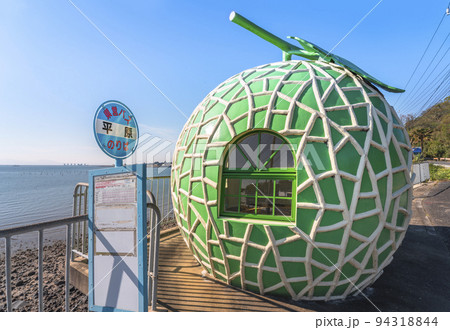 [九州・諫早] 有明海とときめきフルーツバス停通りにあるメロン形の平原バス停。