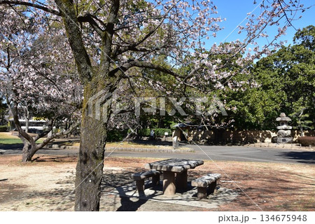 神奈川県 平塚市総合公園日本庭園付近散策路と早咲き桜と休憩スペース