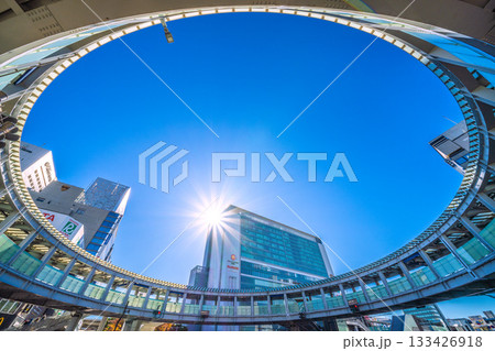 日本の横浜都市景観 横浜駅やJR新横浜駅北口と横浜環状2号線を跨ぐ円形歩道橋などを望む。希望の光