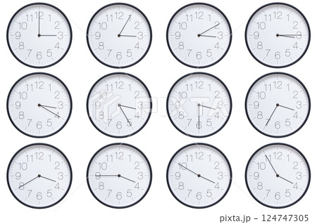 A set of twelve round wall clocks with dark brown frames and white faces showing 5-minute time intervals from 03:00 or 15:00 to 03:55 or 15:55. Clean white background, ideal for time, schedule, and