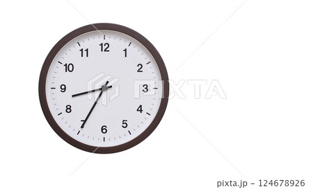 A simple round wall clock with a dark brown frame and a white face displaying 08:35/20:35. Isolated on a white background, perfect for time-related concepts, deadlines, and schedule themes.