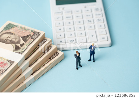ビジネスイメージ、グラフの映るモニターと現金の束、アイソメトリック