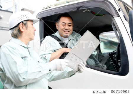 会話をするトラックに乗る作業服を着たミドル男性達