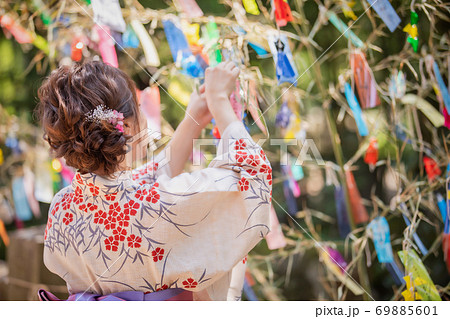 七夕の短冊を飾る浴衣姿の女性