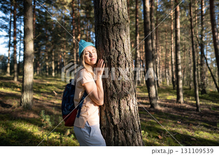 Loving nature purity. Relaxed woman touching tree trunk in autumn forest with closed eyes at sunset.