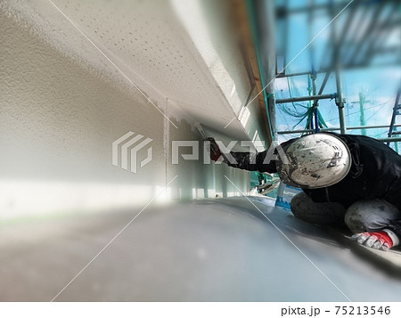 戸建て住宅の外壁上裏(軒天)をハケ塗り塗装する男性塗装職人