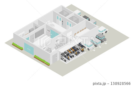 アイソメトリックなマンションの1階部分の共有部分をイメージしたイラスト素材