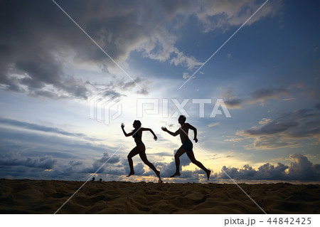silhouettes of athletes running along the beach / sports summer in the warm sea, healthy rest, sports activity, summer vacation