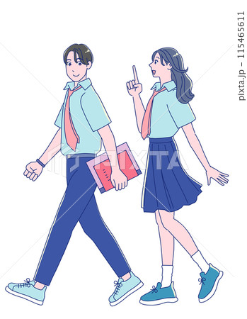 笑顔で歩く制服を着たアニメ風の男女の学生