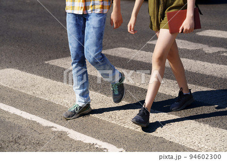teenage schoolchildren, a boy and a girl cross the road at a pedestrian crossing