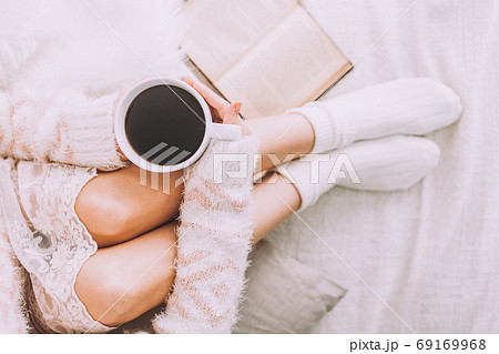 Young woman on the bed with old book and cup of coffee enjoys her stay.