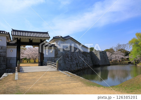 【広島県】快晴の福山城と満開の桜(伏見櫓 筋鉄御門)