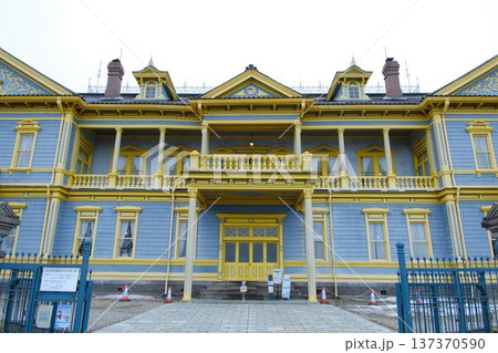 函館・元町のシンボル ブルーグレーと黄色の美しい旧函館区公会堂
