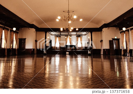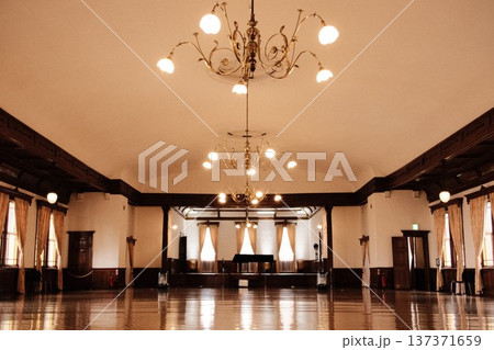 北海道 函館 旧函館区公会堂の豪華な大広間とシャンデリア